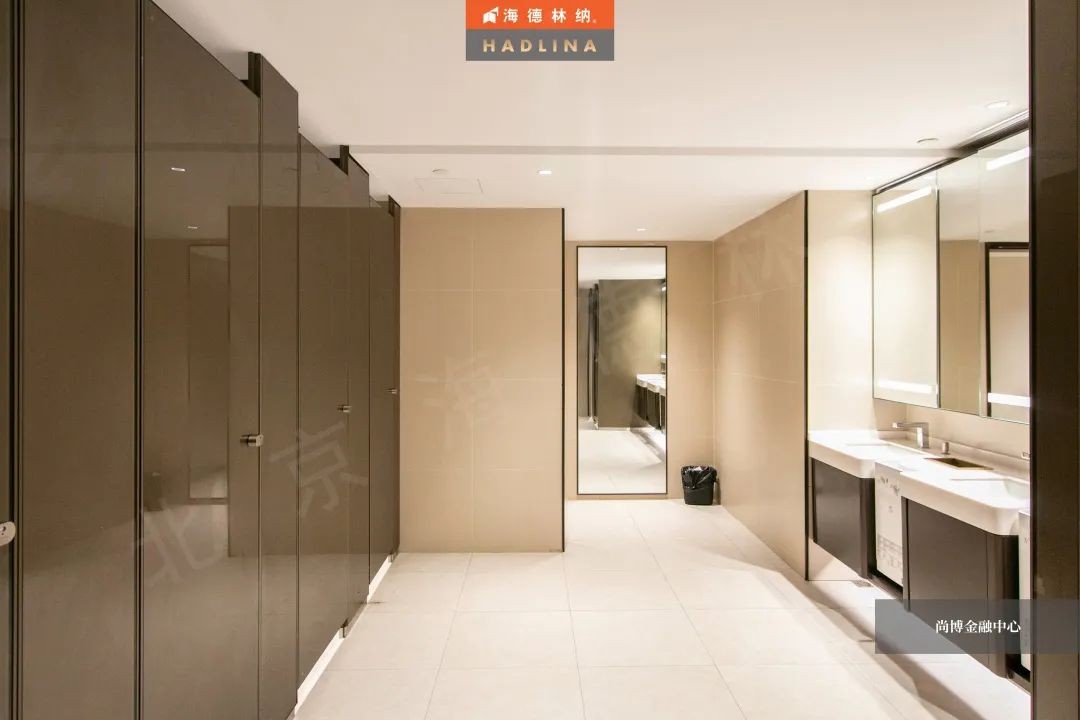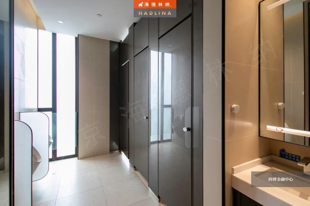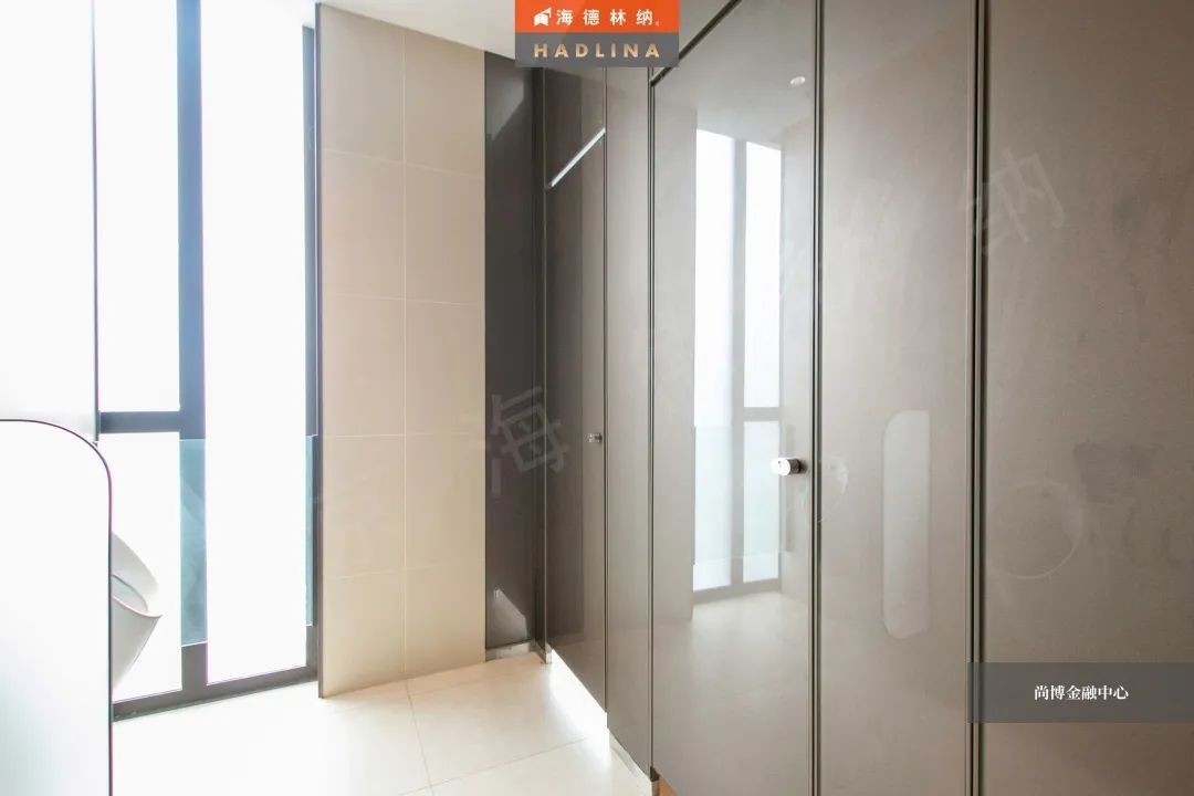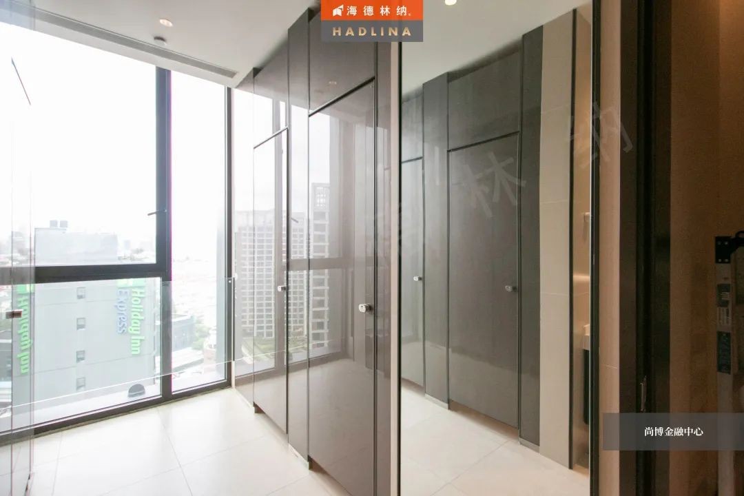 尚博金融中心采用海德林納?天地式衛生間隔斷系統,封閉式空間保護隱私。在設計上,隔斷正面鑲嵌玻璃作點綴,使衛生空間整體通透,在視覺上有很強的延伸感,給人低調奢華的感受。
