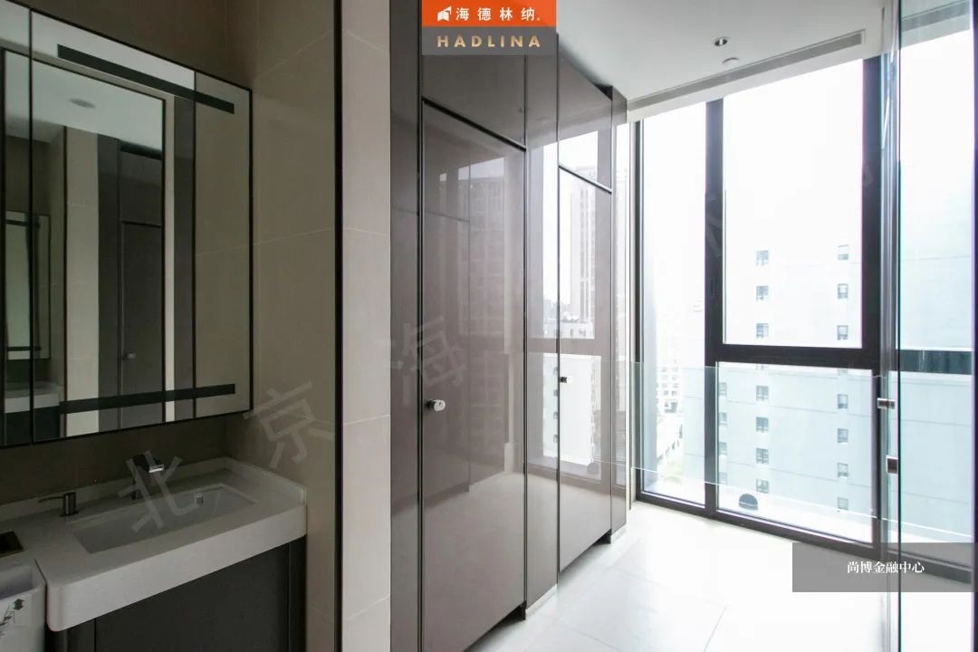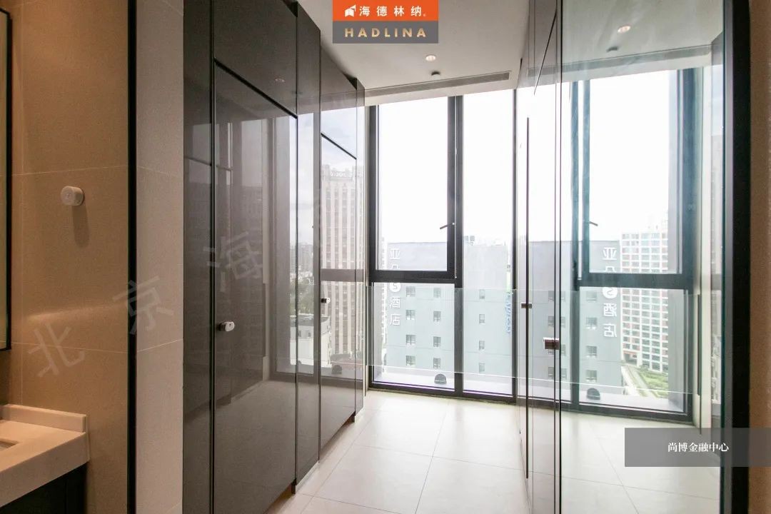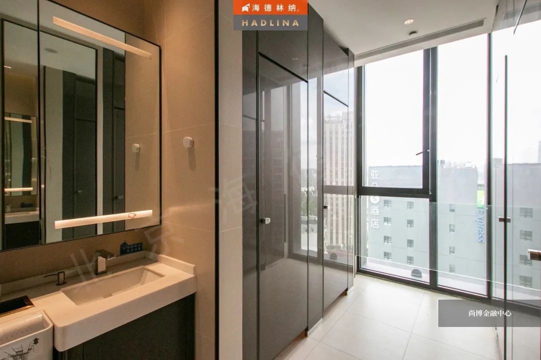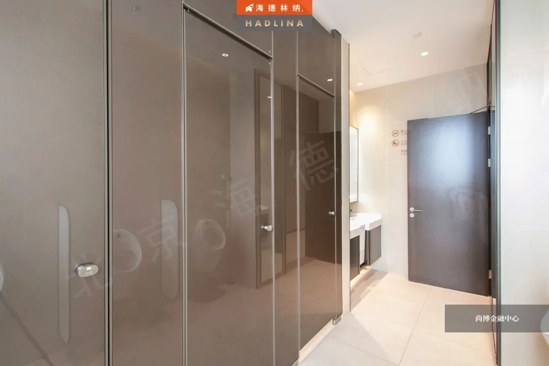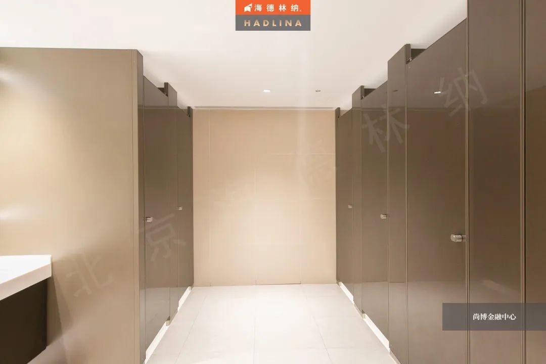 尚博金融中心采用海德林納?天地式衛生間隔斷系統,封閉式空間保護隱私。在設計上,隔斷正面鑲嵌玻璃作點綴,使衛生空間整體通透,在視覺上有很強的延伸感,給人低調奢華的感受。