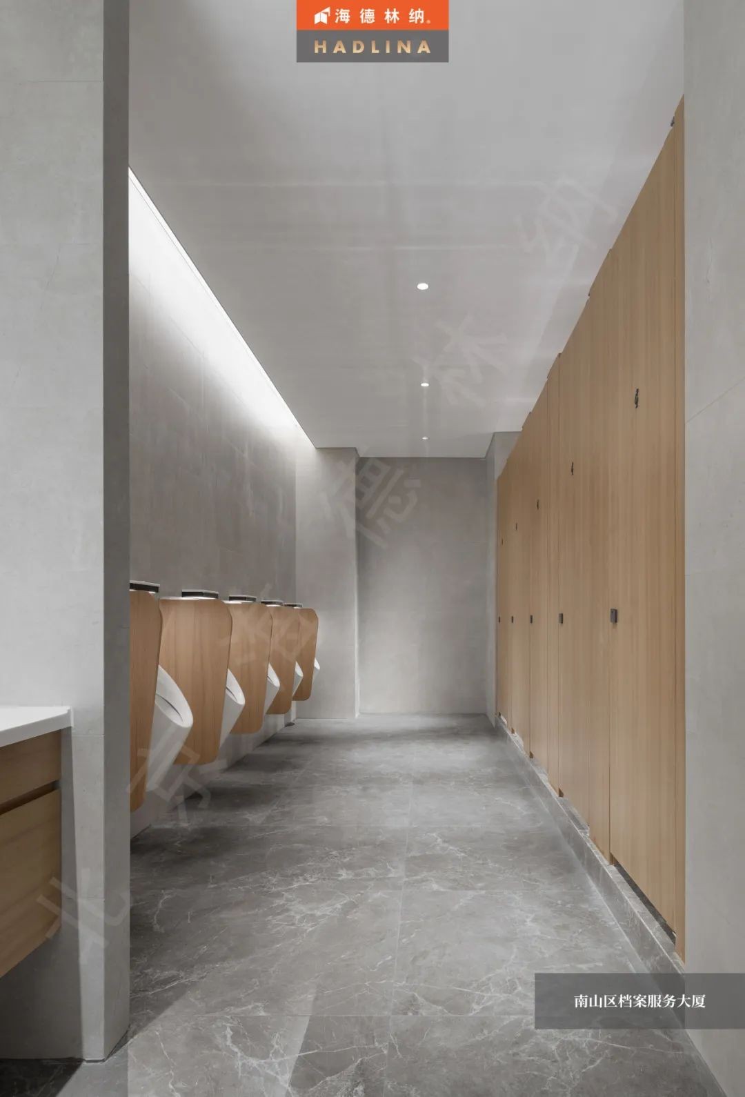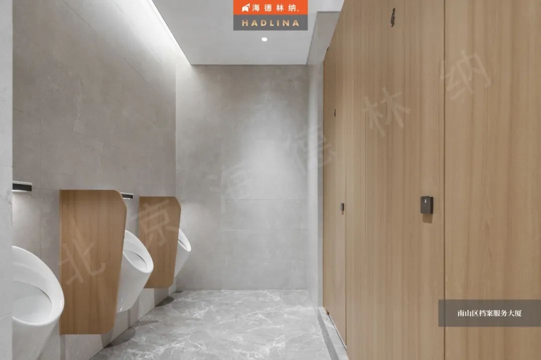深圳檔案大廈衛生間隔斷系統選用的是海德林納?HD-5款式,其獨特的原木色花紋,猶如一幅自然之美的畫卷,與空間相得益彰,為使用者帶來舒適和美好。26mm的厚度,以精湛工藝打造,展現出別具匠心的設計。獨特的材質賦予門體優異的防撞擊性能,而且具有優異的耐腐蝕特性,能延長使用壽命,確保其長久美觀。同時,此隔斷為國家A級防火,能有效隔絕火源,保護整個空間的安全。