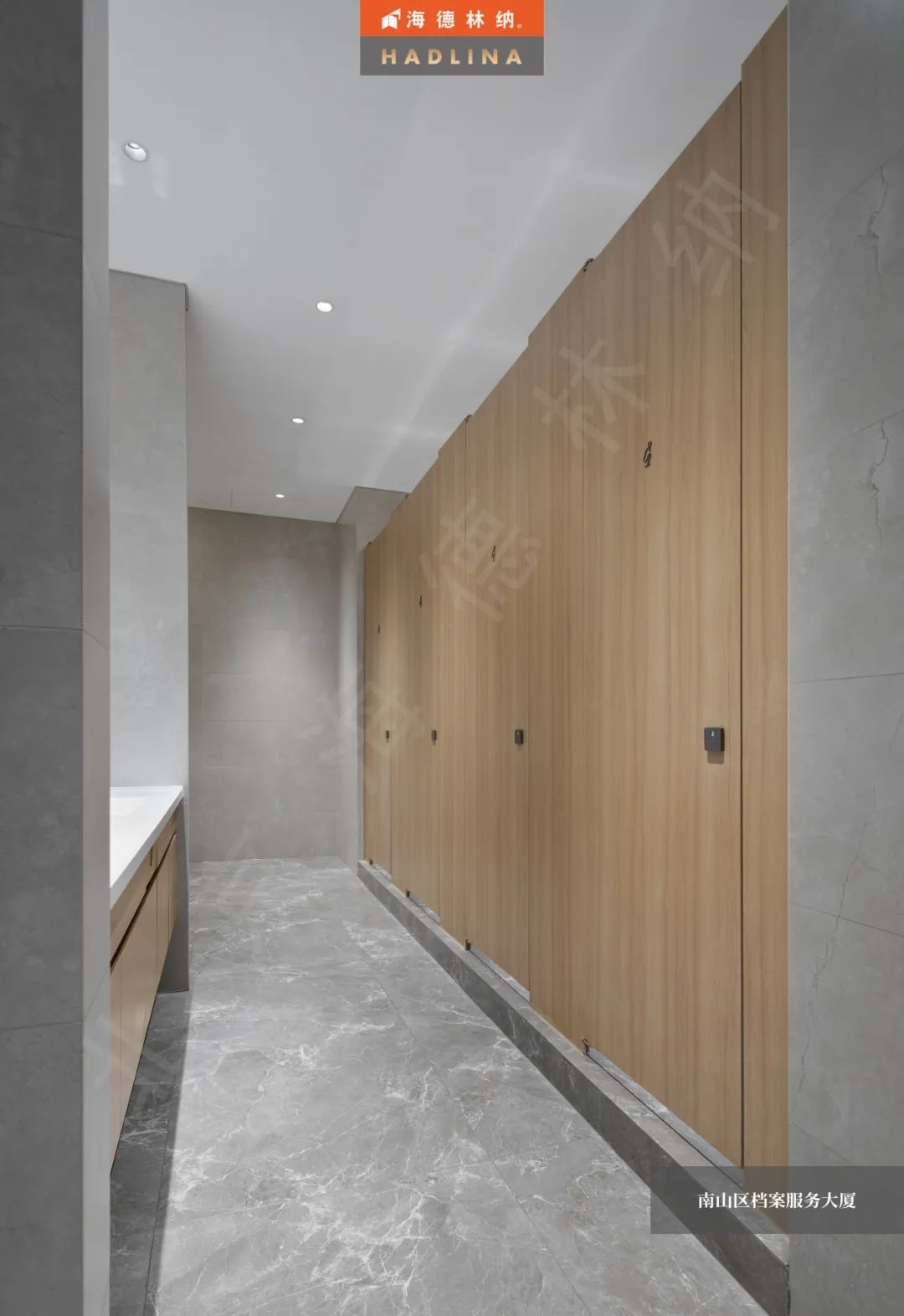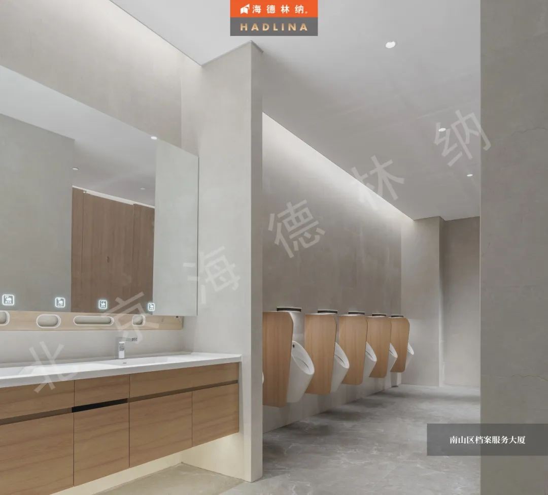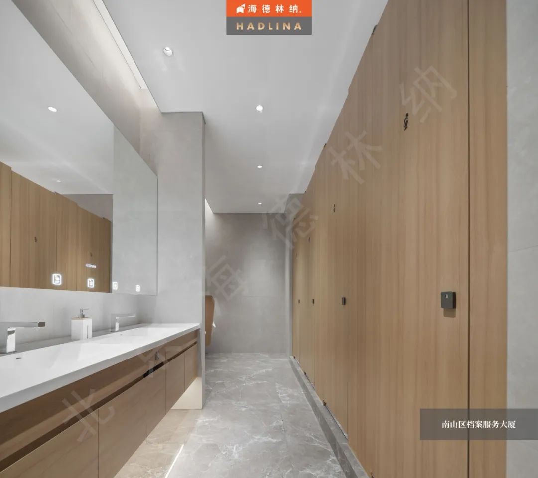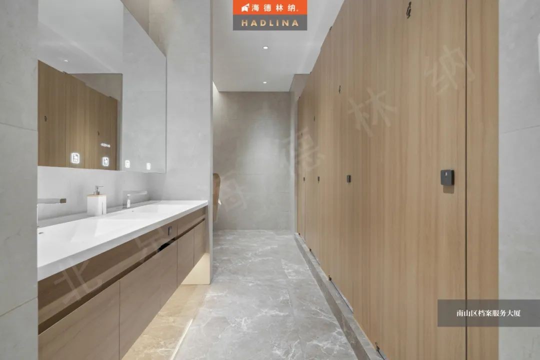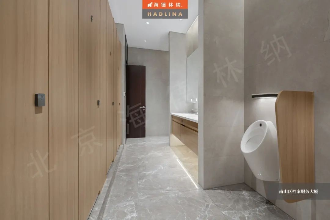 深圳檔案大廈衛生間隔斷采用原木色花紋,展現自然的魅力,恰到好處地融入空間,為整體增色不少。細膩的木紋質感,為使用者帶來溫暖與放松。在這溫暖的氛圍中,人們仿佛置身于自然之中,感受大自然的饋贈。